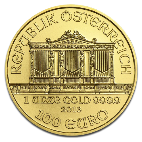The front of the coin depicts the weight, fineness, year and face value of the Philharonic gold coin. Each coin has a face value of 100 Euros, and consists of 9999 fine investment grade gold bullion.
