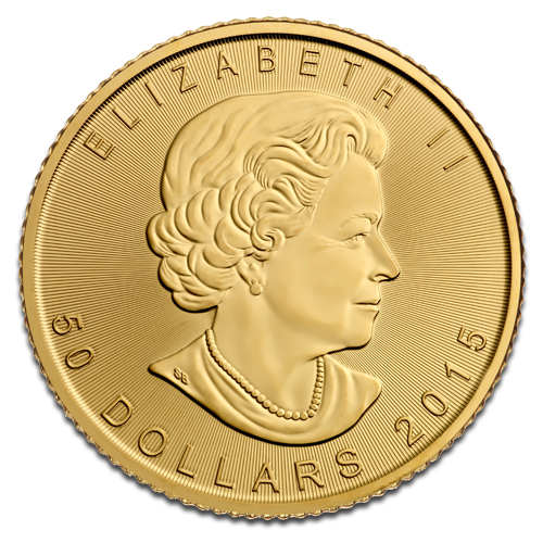 The gold Maple Leaf coin is distinguishable for the image of Canada's iconic maple leaf on the reverse side. Designed by Canadian artist, Lilyane Coulombe, the intricate engraving of the 2015 design demonstrates outstanding detail and brilliance that is expected on such lucrative coins. The reverse also includes the country of origin, confirmation that the 1oz coins are made with .9999 OR PUR together with a maple leaf privy mark which is lasered with unprecedented security features. The obverse features the often used profile of Her Majesty Queen Elizabeth II created by Susanna Blunt in 2003. The image shows Her Majesty facing towards the right and wearing a pearl necklace.