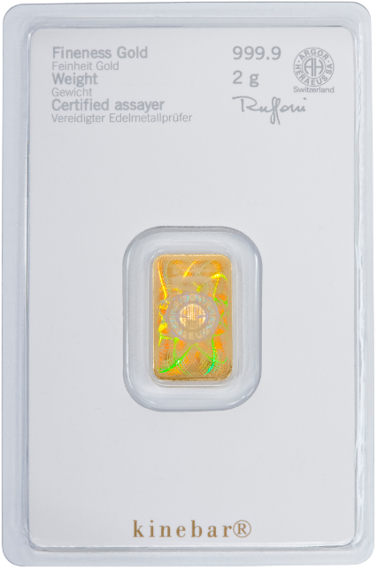 Certified 2 gram Heraeus gold Kinebar with hologram on the back.