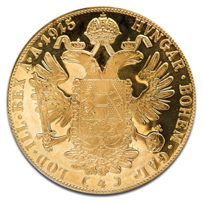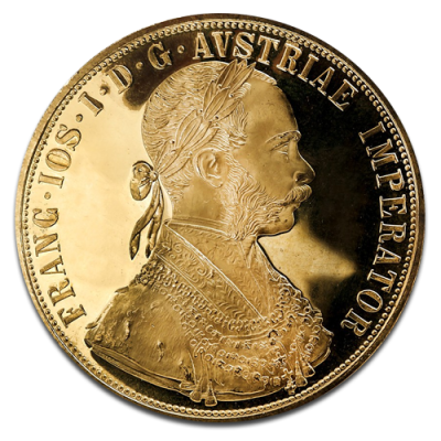 The 4 Ducats gold coin is a commemorative coin, just like the 1 Ducat gold coin. These Austrian coins, all commemorate the Emperor Franz Joseph I who died in 1916. That is why all the 4 Ducats gold coins issued after 1915 are restrikes of the original Ducats. That is the reason for which on all these Austrian gold coins it appears the year 1915, it does not matter in which year they were minted by the Austrian Mint.