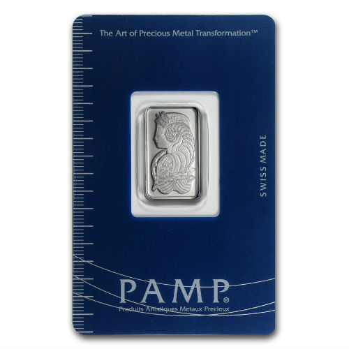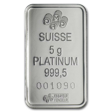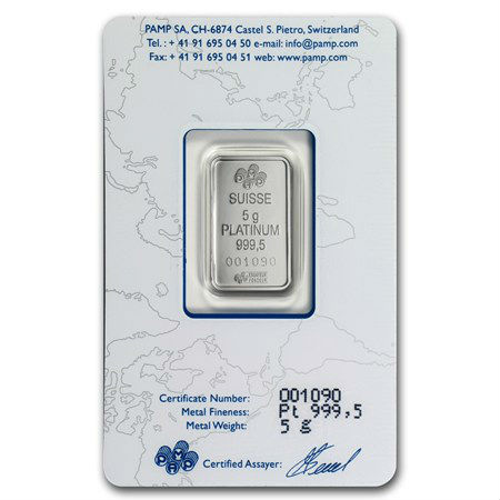 Each bar comes individually sealed in a plastic certicard, protecting the bar and verifying its authenticity. The front of the PAMP 5 gram platinum bar features an image of Lady Fortuna on it. The reverse of the bar features the PAMP logo, with the weight, fineness and serial number of the bar.
