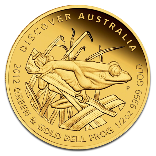 The 2012 Green and Gold Bellfrog 1/2 oz gold coin weighs 1,560 g of .9999 purity gold. It is 25.60mm in diameter, it is 2.40mm thick, and has a nominal value of AUS $50.