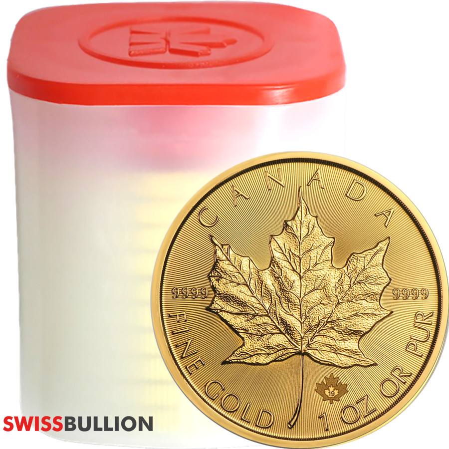 SwissBullion.eu sell the 2019 gold Maple Leaf for VAT-exempt secure Swiss storage. Coins are available for purchase individually, in tubes of 20 pieces, and in monster boxes. In spite of their elegant designs, 2019 Maple Leafs carry a relatively low premium over the precious metals spot price, and are therefore hugely popular with investors looking to buy gold coins.