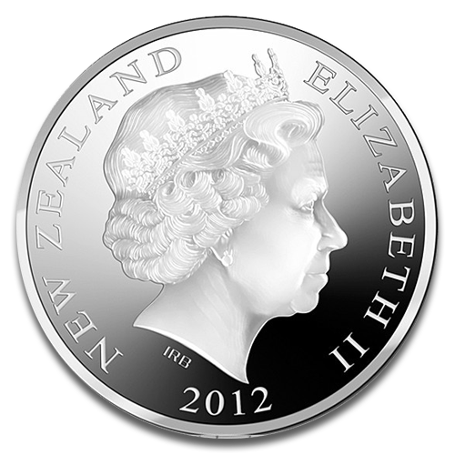 The obverse of the New Zealand Kiwi 1oz silver coin illustrates the engraver of Queen Elizabeth II designed by Ian Rank-Broadley, which has his initials engraved under the neck of Her Majesty. Other inscriptions are NEW ZEALAND the issuing country, 2012 the minting year, and ELIZABETH II.